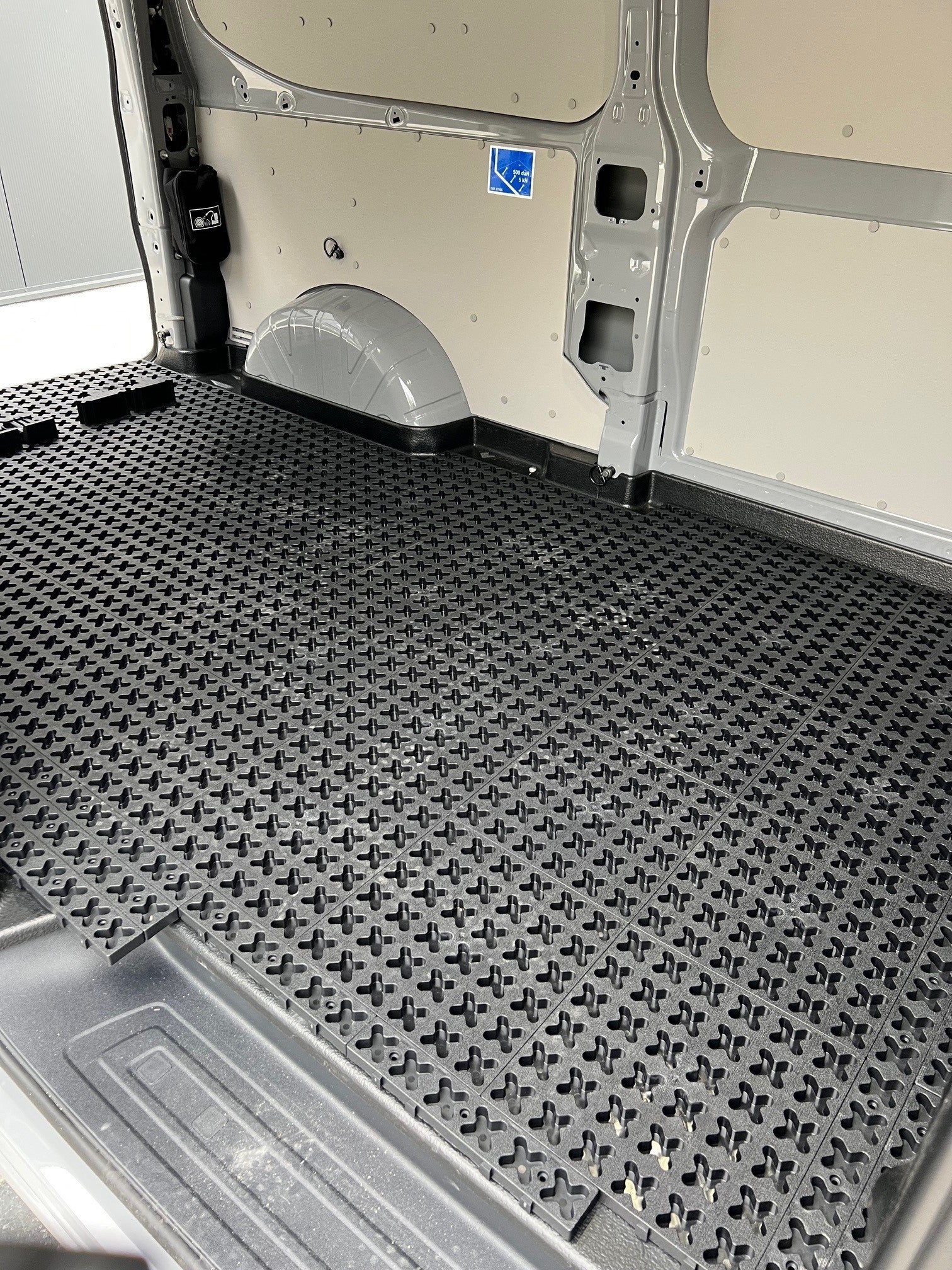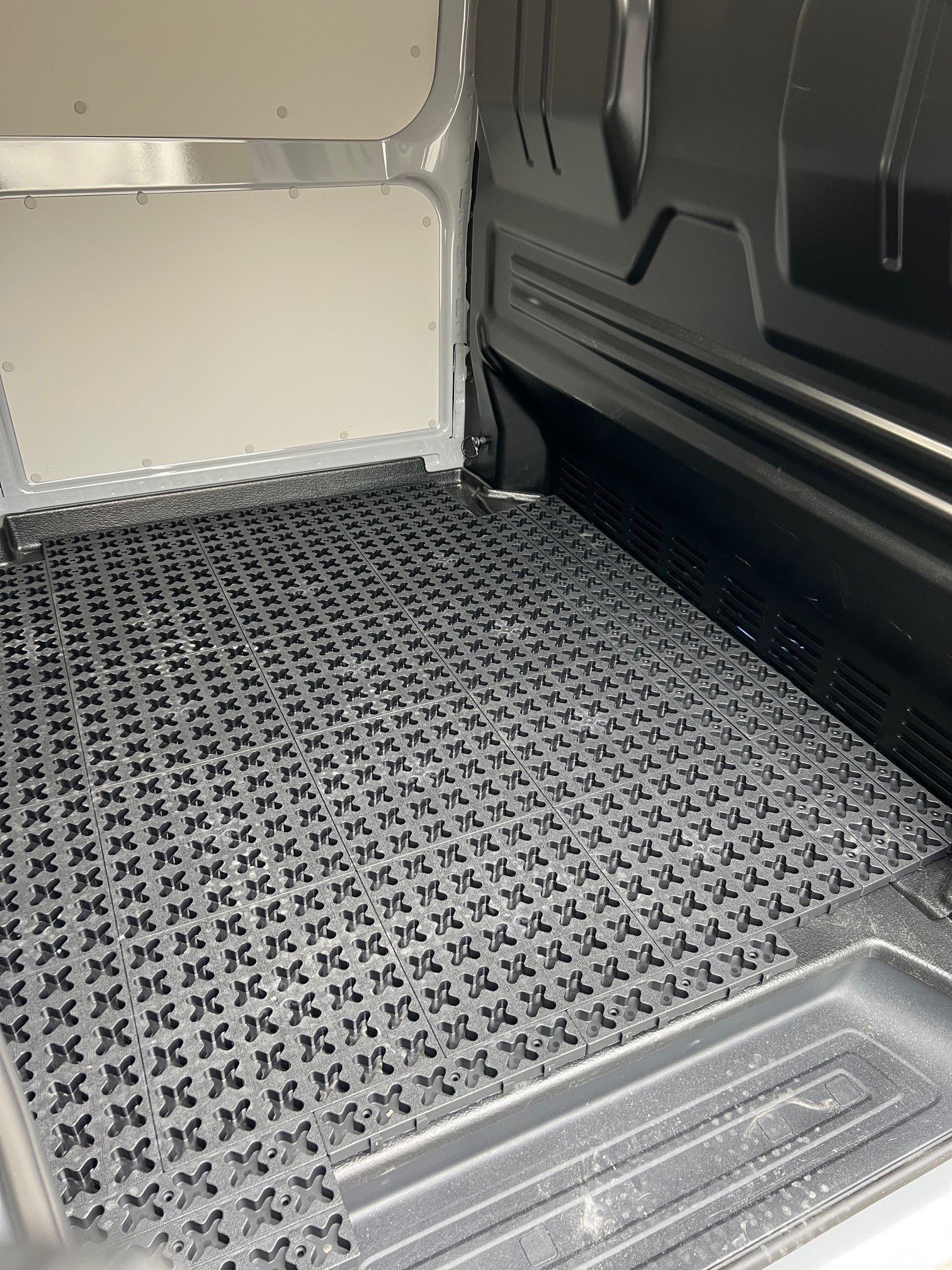 A modular cargo floor for large L2 vans. The smooth TMAT surface lets heavy cargo slide easily into place, then locks it down securely using TMAT blockers. Functions as both a protective floor and a practical cargoslide-style system.