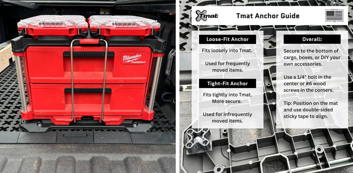 The Tight-fit anchors snap-in for a tighter fit and require more force to remove than traditional Loose-fit Tmat anchors. This fit makes them ideal for less frequently removed accessories such as Milwaukee Packout Mounts, bike fork mounts, and custom DIY anchors.