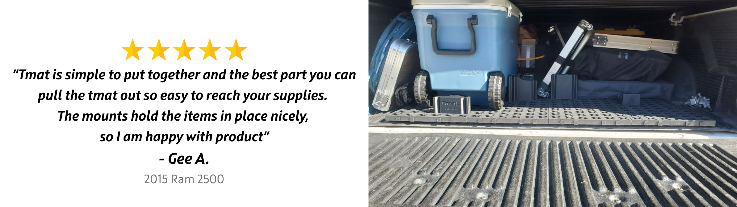 Tmat can be assembled and installed in under 5 minutes. No drilling or modifying your vehicle.