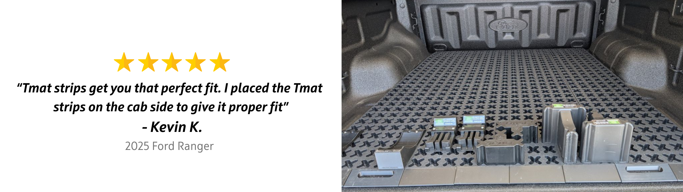 Outfit your Ford Ranger with a cargo management system built for efficient truck bed organization. Adjustable blockers plug into the mat in any configuration, creating compartments for tools, gear, and equipment. Designed to fit between the wheel wells, it slides out to the tailgate for quick, easy access. Works with drawer systems, bed slides, and other custom setups.