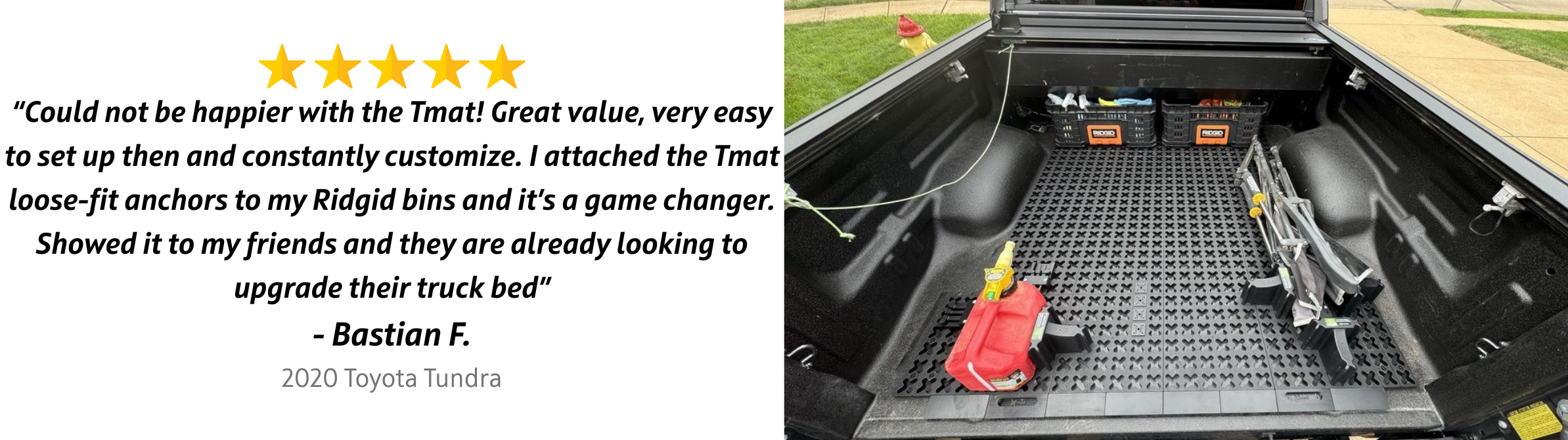 Expand your cargo management. Install Tmat and organize your trailer, van, utv bed, tac room - anywhere you work.